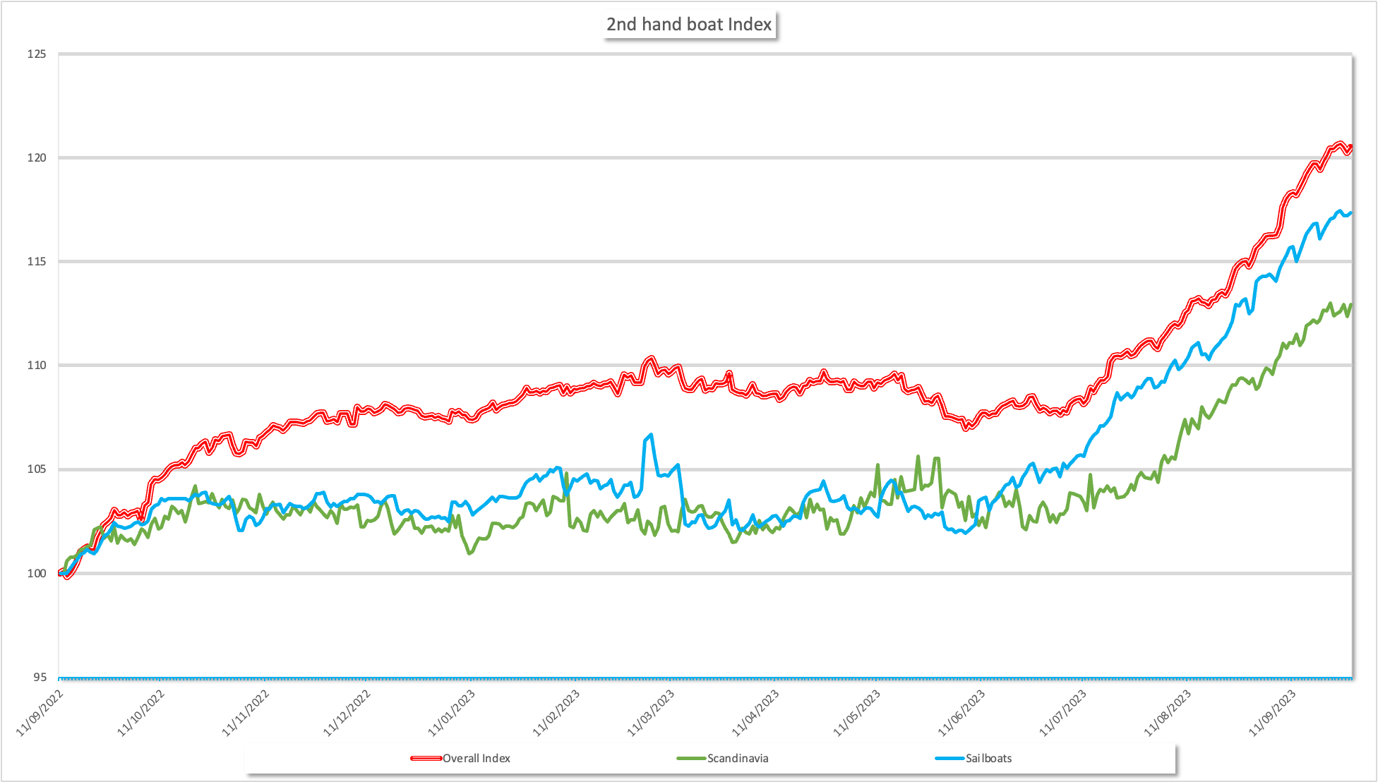 From early June until now – the number of sailboats for sale have grown from Index 104 (4%) to 115 (15%) – closing in on motorboats fast. The relative number of sailboats for sale is still growing faster per month than the number of motorboats.